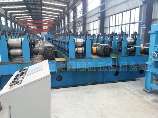 在线冲孔、切断生产线 重型多工位快换生产线是包含上料喷丸烤漆冷弯成型生产线跟踪切断堆垛的全自动化生产线,由于需要生产好几种产品。而前段于后段工序不需要重复投资,就把几条冷弯成型生产线并列,采用电器控制在导轨上往返移动,更换规格,以达到更节省成本,又可以加速更换不同产品的目的。