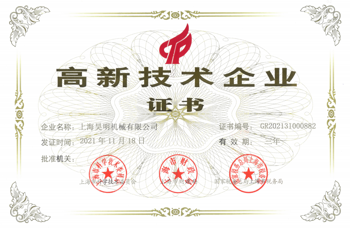 我司于2021年11月18日荣获高新技术企业证书,由上海科学技术委员会、上海市财政局及国家税务总局上海市税务局比准。